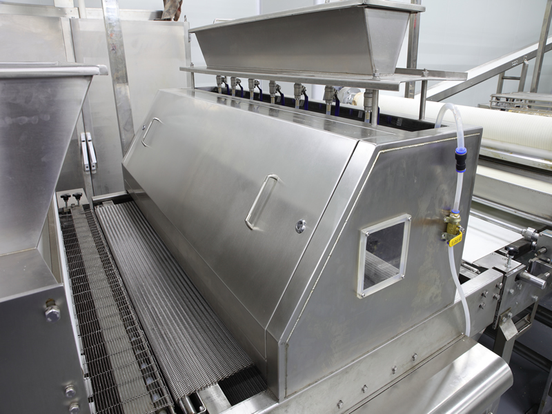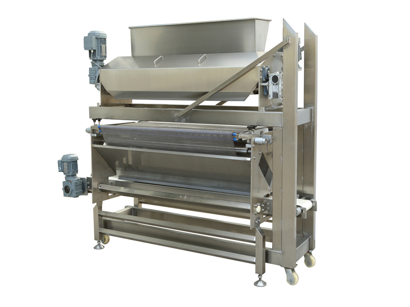 該設(shè)備應用于將固體顆粒或者粉狀調(diào)味料,鹽,糖,芝麻及果仁片等撒布在面皮或則餅干上。回收機回收多余的撒布物料循環(huán)利用。